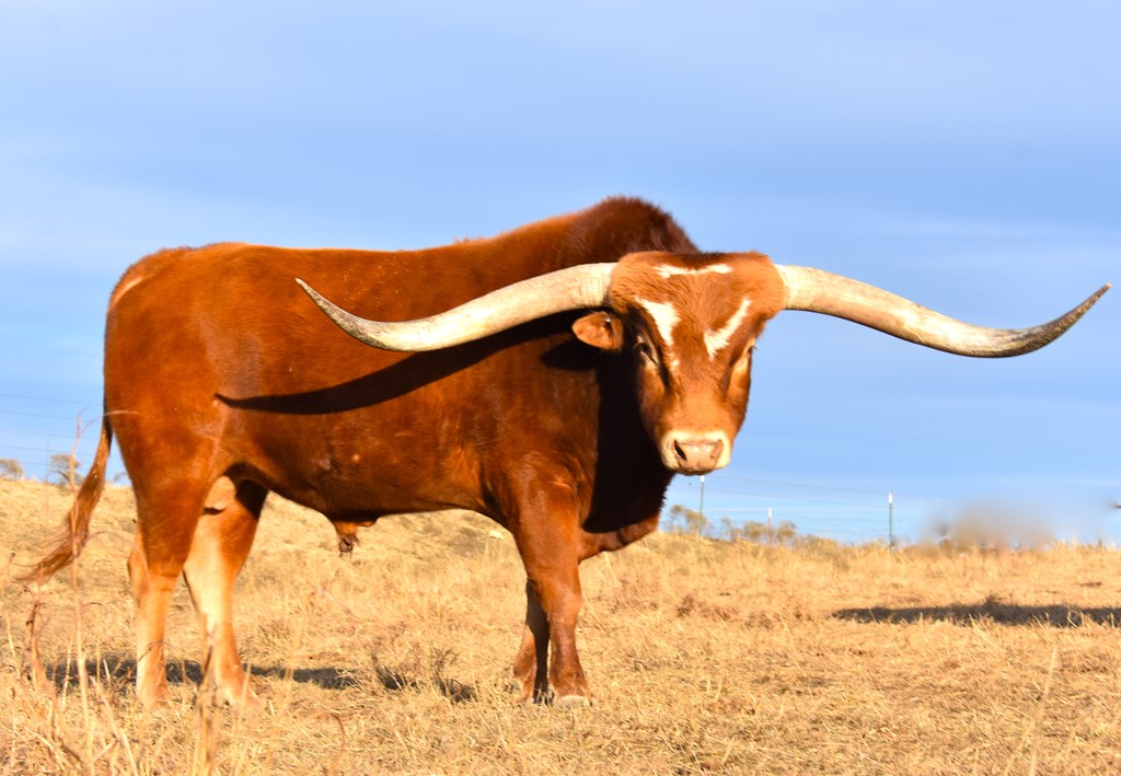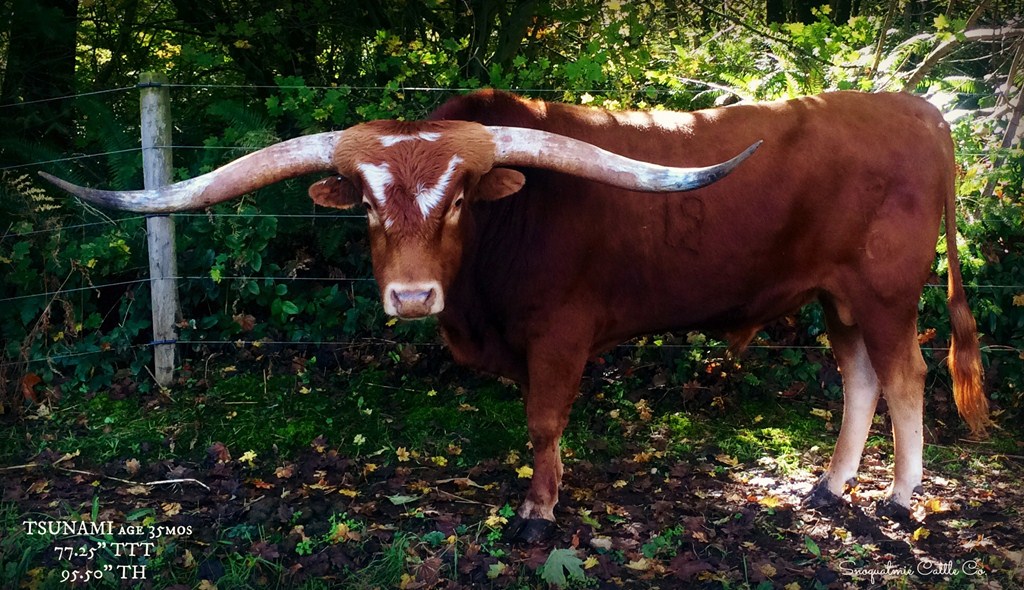 Tsunami is one of the longest total horn bulls in the breed at 116.75". A son of Concealed Weapon and RC Pacific Mermaid, Tsunami is a proven herd sire with deep and high quality progeny. His full sister SHR Majestic Mermaid is over 96 inch TTT and is set to make 100 inch one day! Horn pedigree: 1 animal over 90" TTT; 6 over 80" TTT
